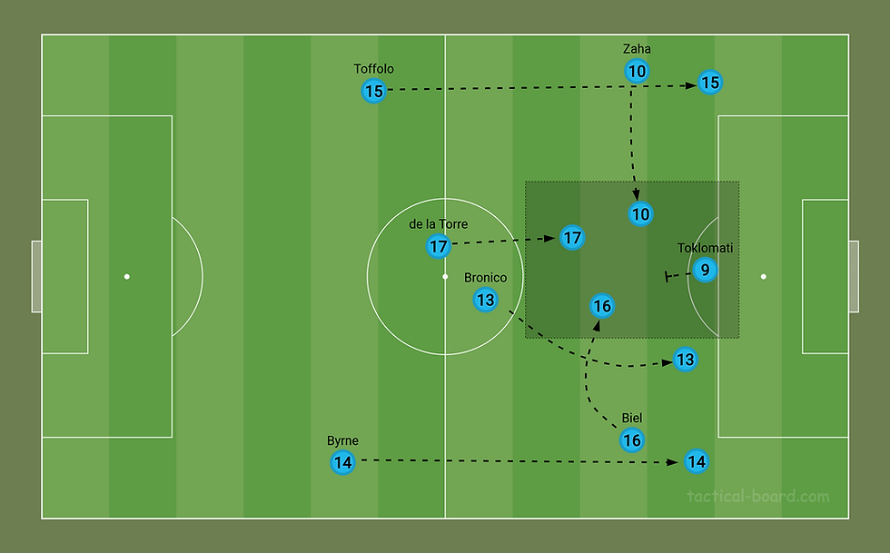 Things could get really interesting if Smith opts to put Biel at rightwing with both wings inverting. This would tuck Zaha and Biel inside with Toklomati and also allow de la Torre to float into this central area with them, putting four of your most technically dangerous players in proximity to each other in one of the most dangerous areas on the field (see tactical board below).